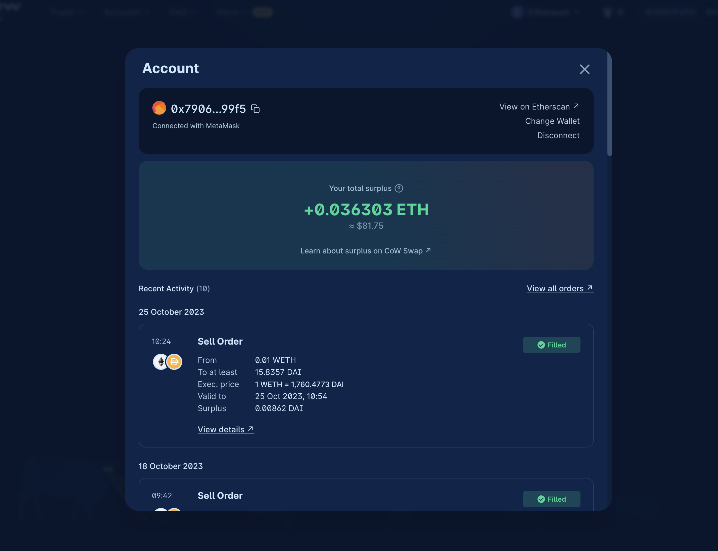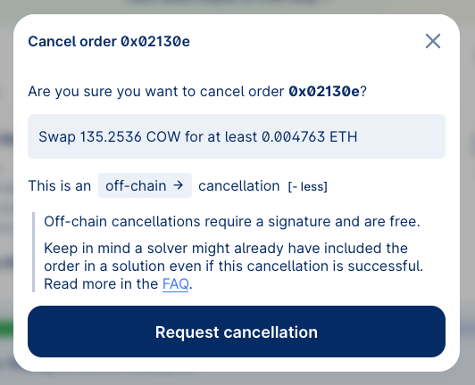 Changed your mind? Not a problem! CoW Swap makes it easy and gasless1 to cancel your order.
