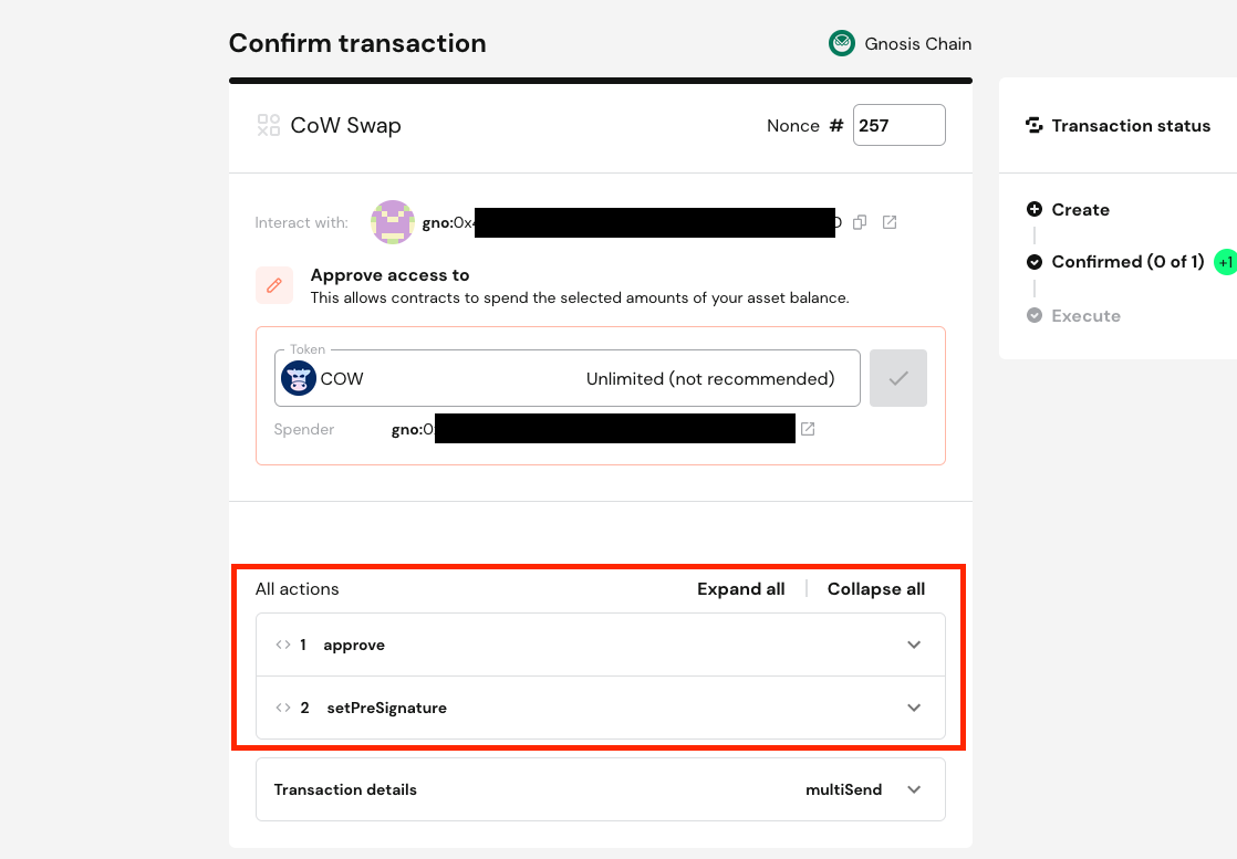 CoW Swap has a special integration with Safe when opened as a Safe app, where the approval and order placement transactions can be combined into a single Safe transaction.